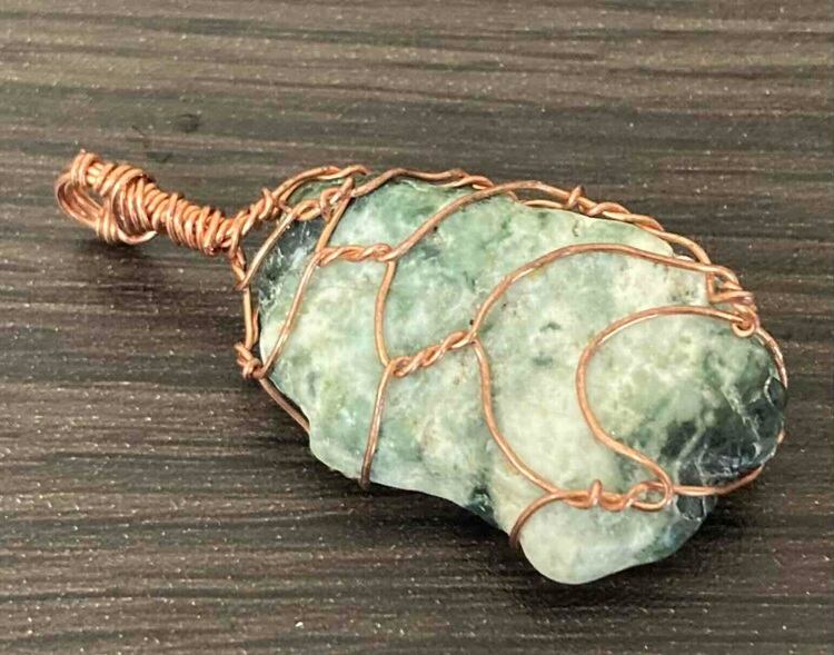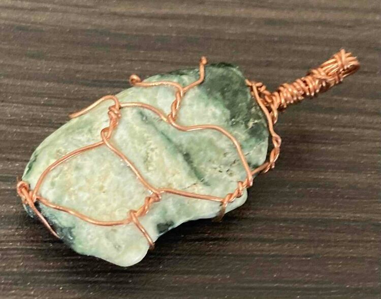今回、紹介する透過度の良い原石は阿波翡翠(ジェダイト)です。銅を少し錆びさせヴィンテージ風のワイヤーで包んで見ました。透明感のある良質の原石を使用しております。