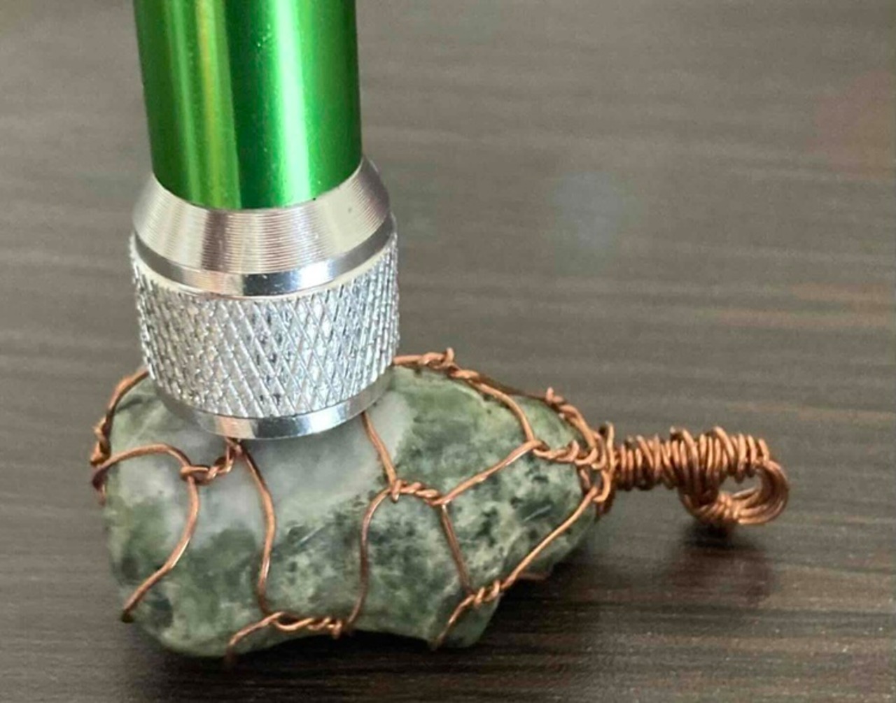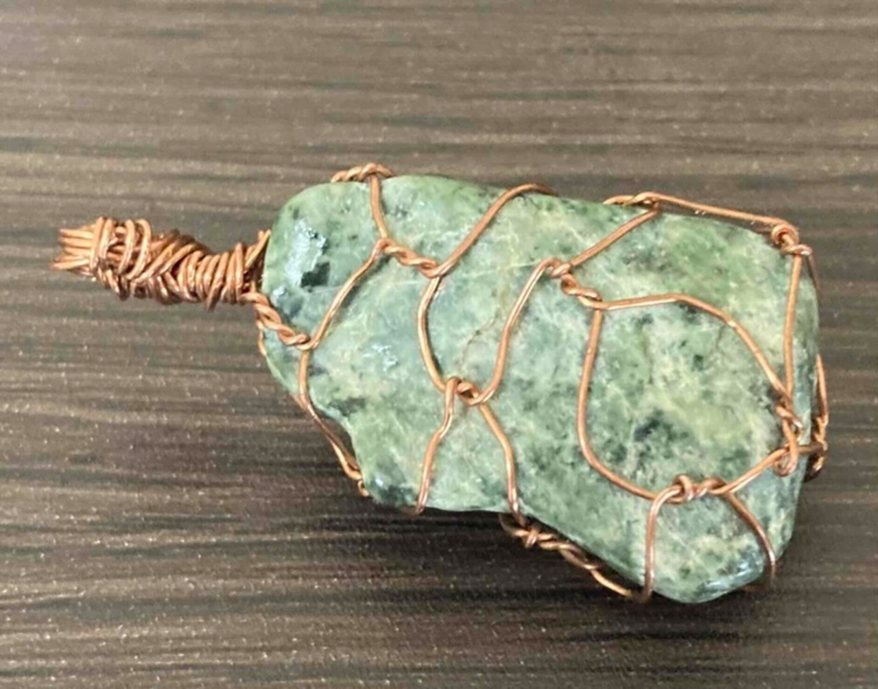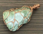 今回、紹介する透過度の良い原石は阿波翡翠(ジェダイト)です。銅を少し錆びさせヴィンテージ風のワイヤーで包んで見ました。透明感のある良質の原石を使用しております。