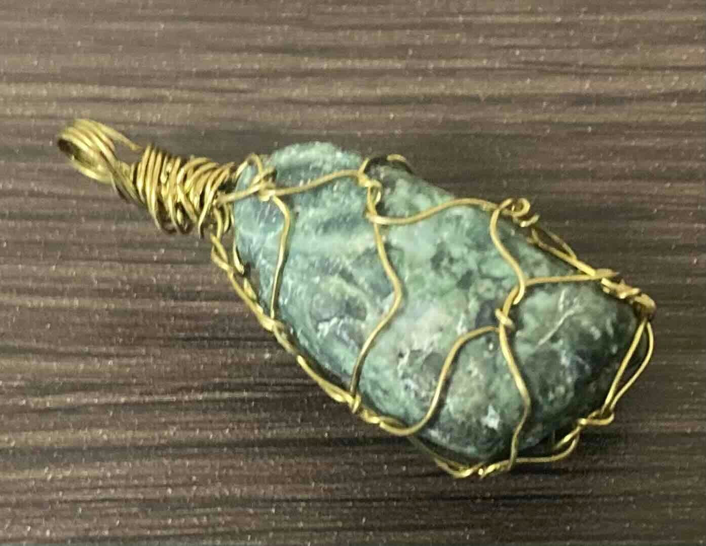 透過度の良い原石の「阿波翡翠(ジェダイト)」です。真鍮を少し錆びさせヴィンテージ風のワイヤーで包んで見ました。透明感のある良質の原石を使用しております。
