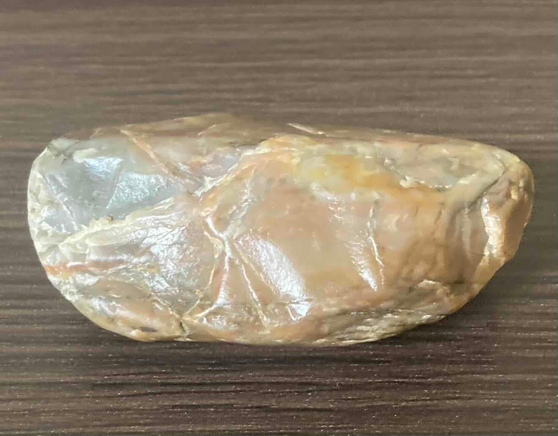 部分的に半透明感があり、光にかざすと奥行きのある色の重なりが見えるのも特徴です。全体的に温かみのある色調で、研磨すれば滑らかな艶と深みのある美しい模様が際立つと考えられます。