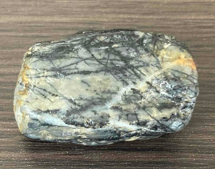 この黒糸巻き瑪瑙は、漆黒の地に細やかな糸状の模様が絡み合う、極めて希少な阿波産原石です。