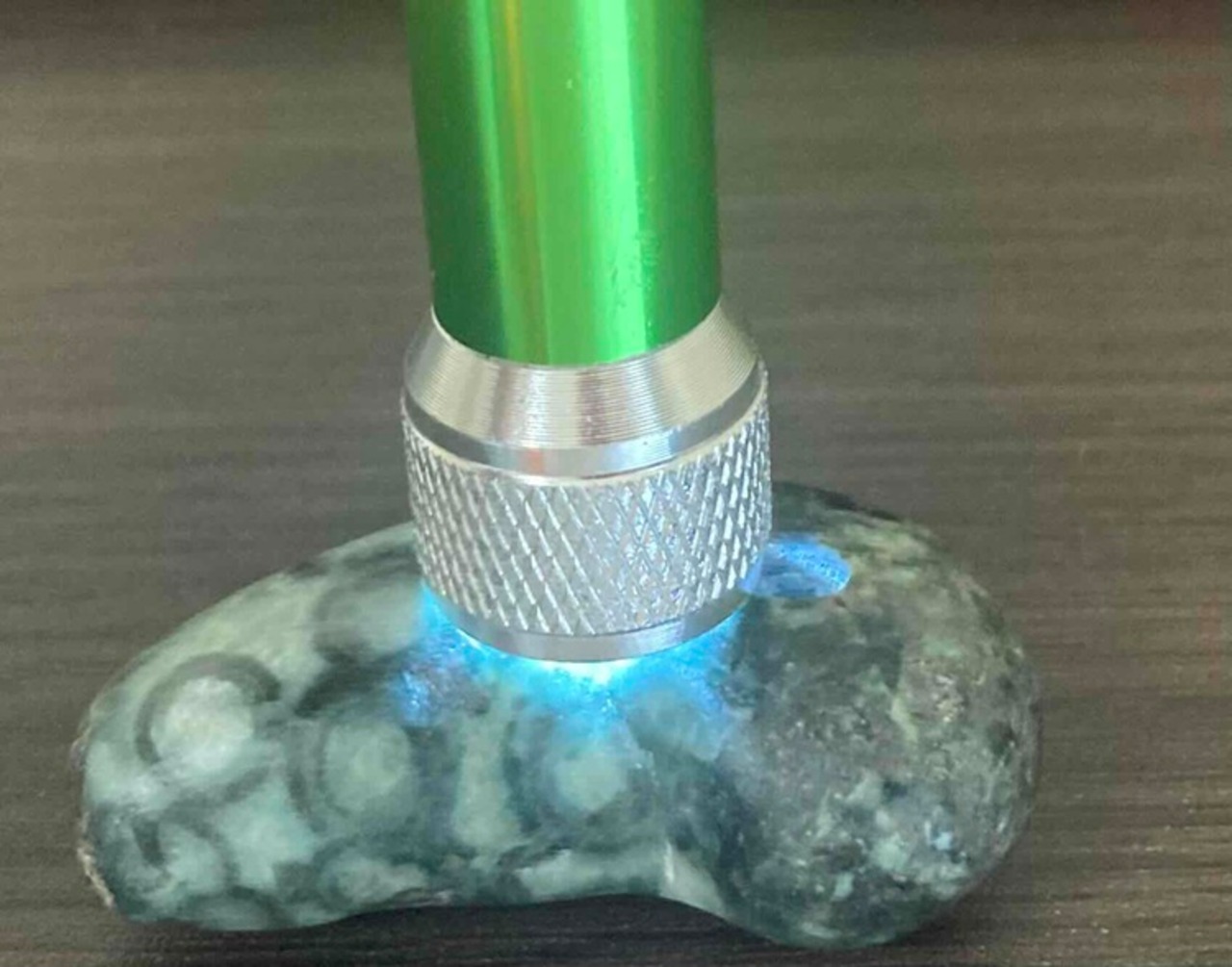 緑質系の謎のオーブが石の奥に宿り、光の角度によって淡く揺らめく輝きを放ちます。