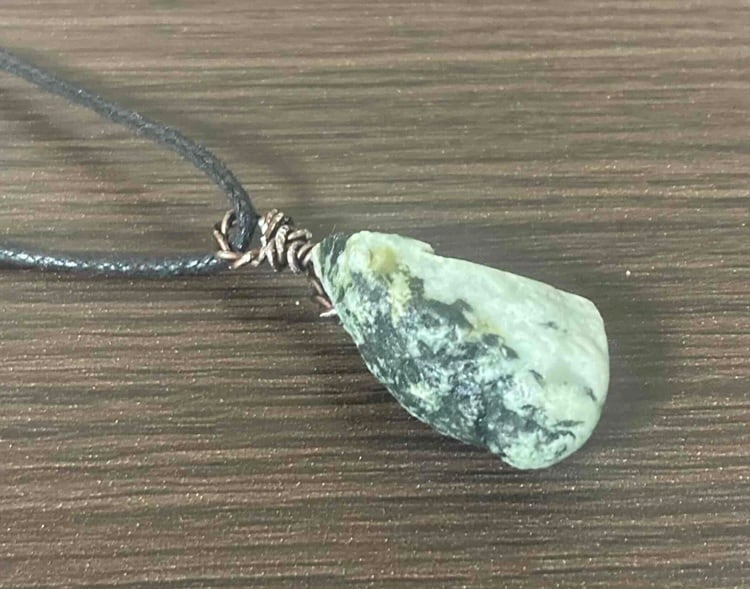 このペンダントに込められた翡翠(ひすい)は、阿波の山々にも息づく聖なる石とされ、古より“魂を鎮め、道を照らす”守護の力を持つと伝えられています。