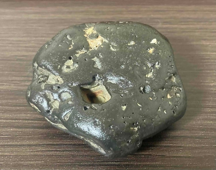 宇宙を旅して地球に届いた、存在感のある少し大きめの隕石原石です。自然に生じた孔(あな)を活かすことで、横笛のように音を鳴らすこともできる、たいへん珍しい個体。
