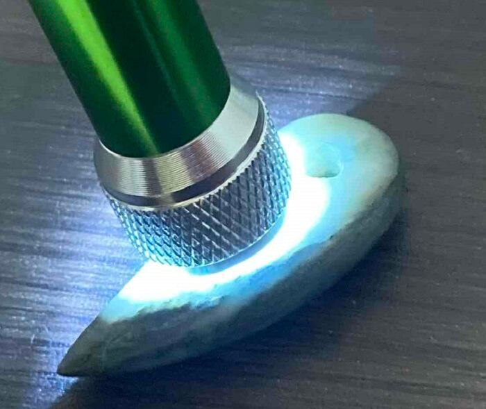 今回、紹介する勾玉は、緑・白系の刀剣型勾玉です。平らで着けやすい綺麗なデザインです。伝次郎の創作個性が生きる勾玉と言えます。