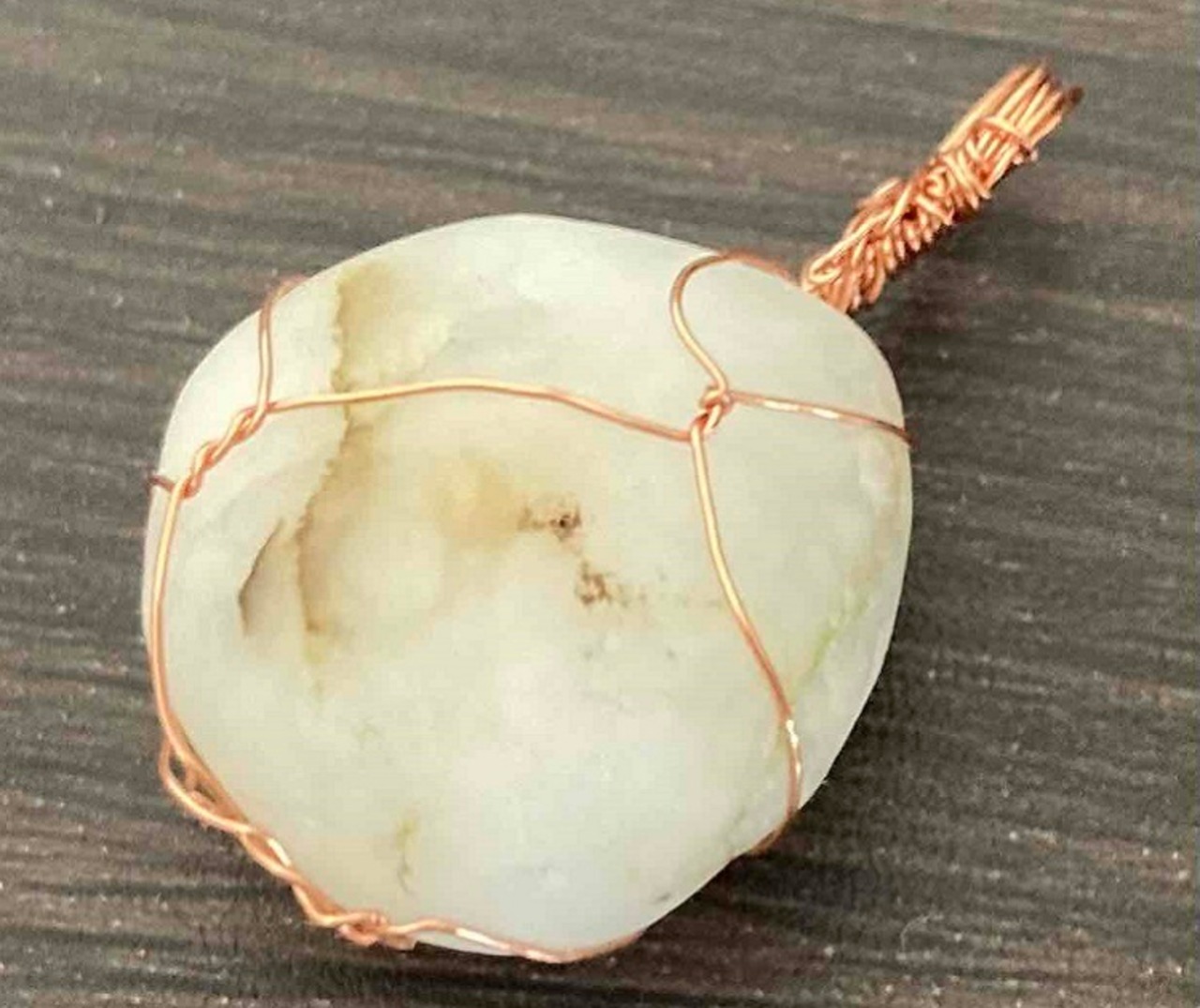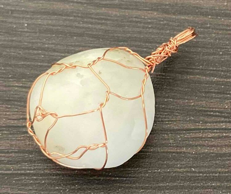 今回、紹介するワイヤージュエリーの原石は白翡翠。ワイヤー素材は銅にコーテングしたものを使用しております。