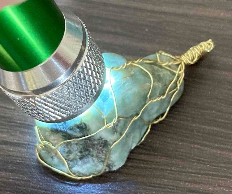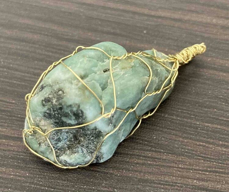 今回、紹介するワイヤージュエリーの原石は緑翡翠。ワイヤー素材は銅にコーテングしたものを使用しております。