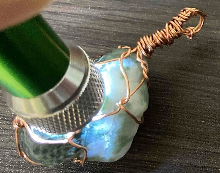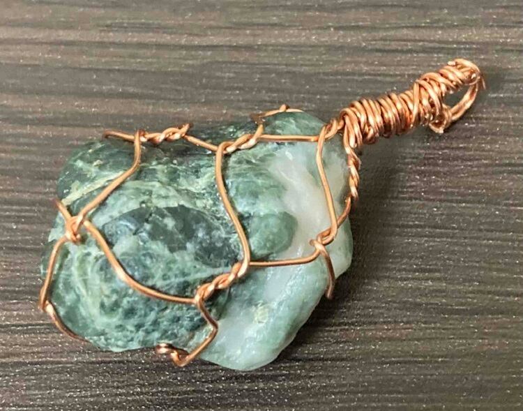 今回、紹介する翡翠原石は希少な緑です。銅のワイヤーで作られた美しい網目模様のワイヤージュエリーです。