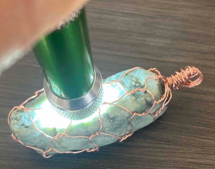 今回、紹介する翡翠原石は希少な薄緑です。銅のワイヤーで作られた美しい網目模様のワイヤージュエリーです。