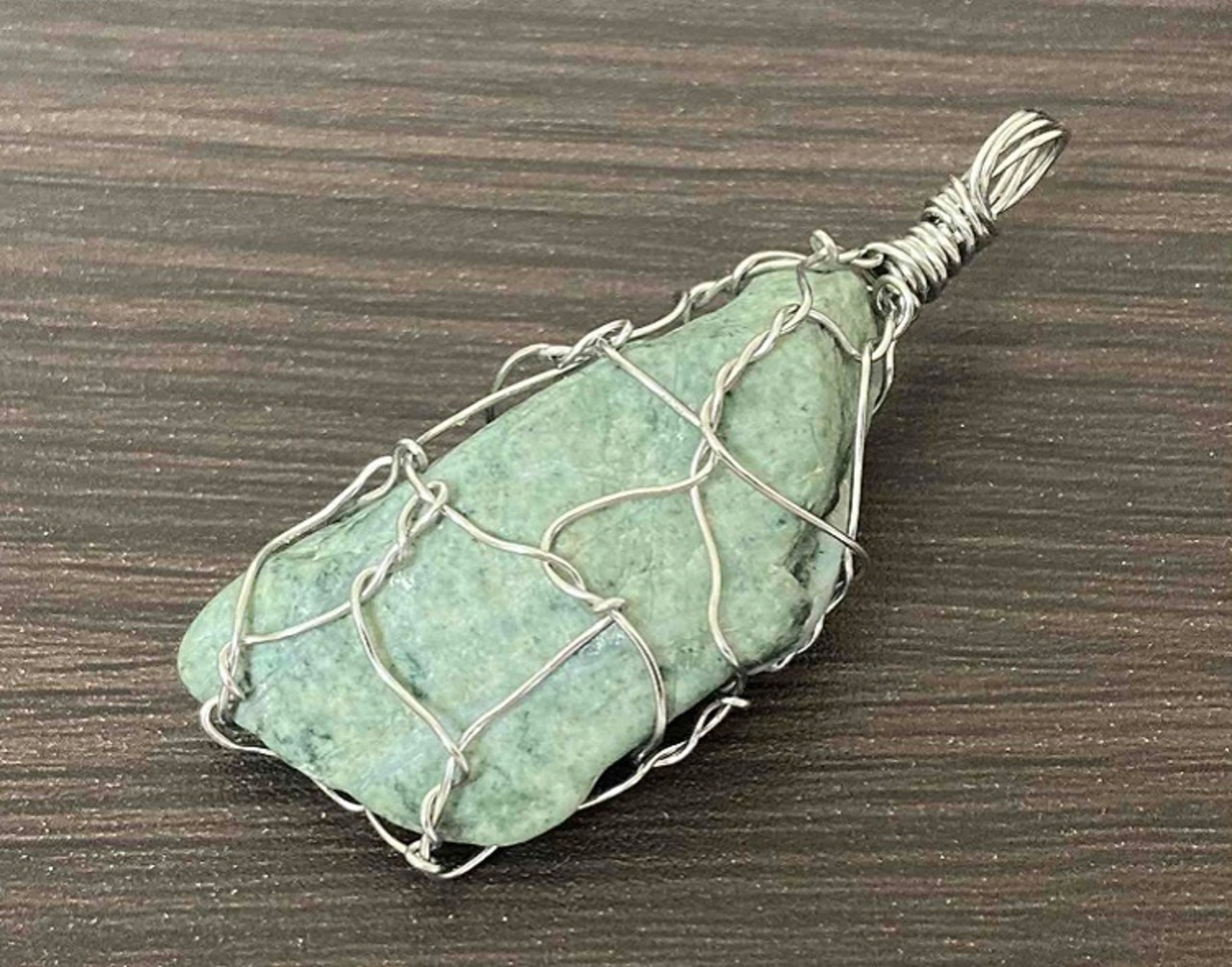 今回、紹介する原石は天然阿波翡翠(ジェダイト)です。ステンレスのワイヤーで包んで見ました。