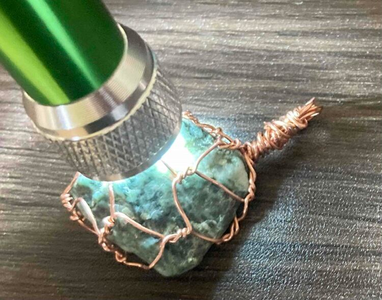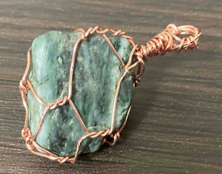 今回、紹介する原石は天然阿波翡翠(ジェダイト)です。銅のワイヤーで包んで見ました。