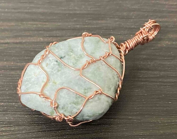 今回、紹介する原石は天然阿波翡翠(ジェダイト)です。銅のワイヤーで包んで見ました。