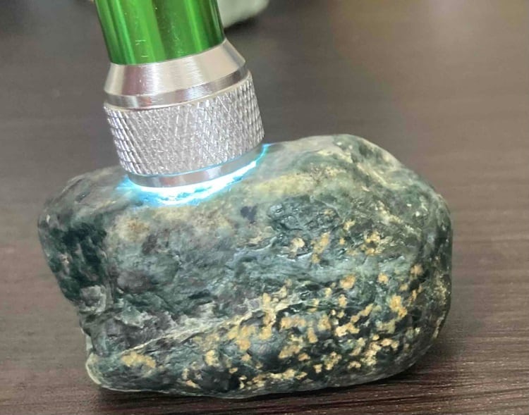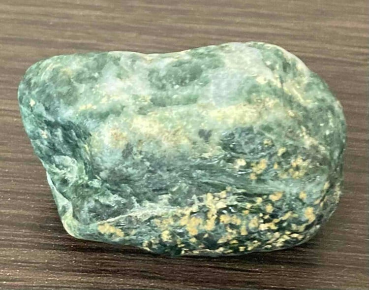 今回、紹介する翡翠原石は、珍しい金木犀紋様が入っている希少な原石です。濃い緑の中にオレンジの紋様が入っています。